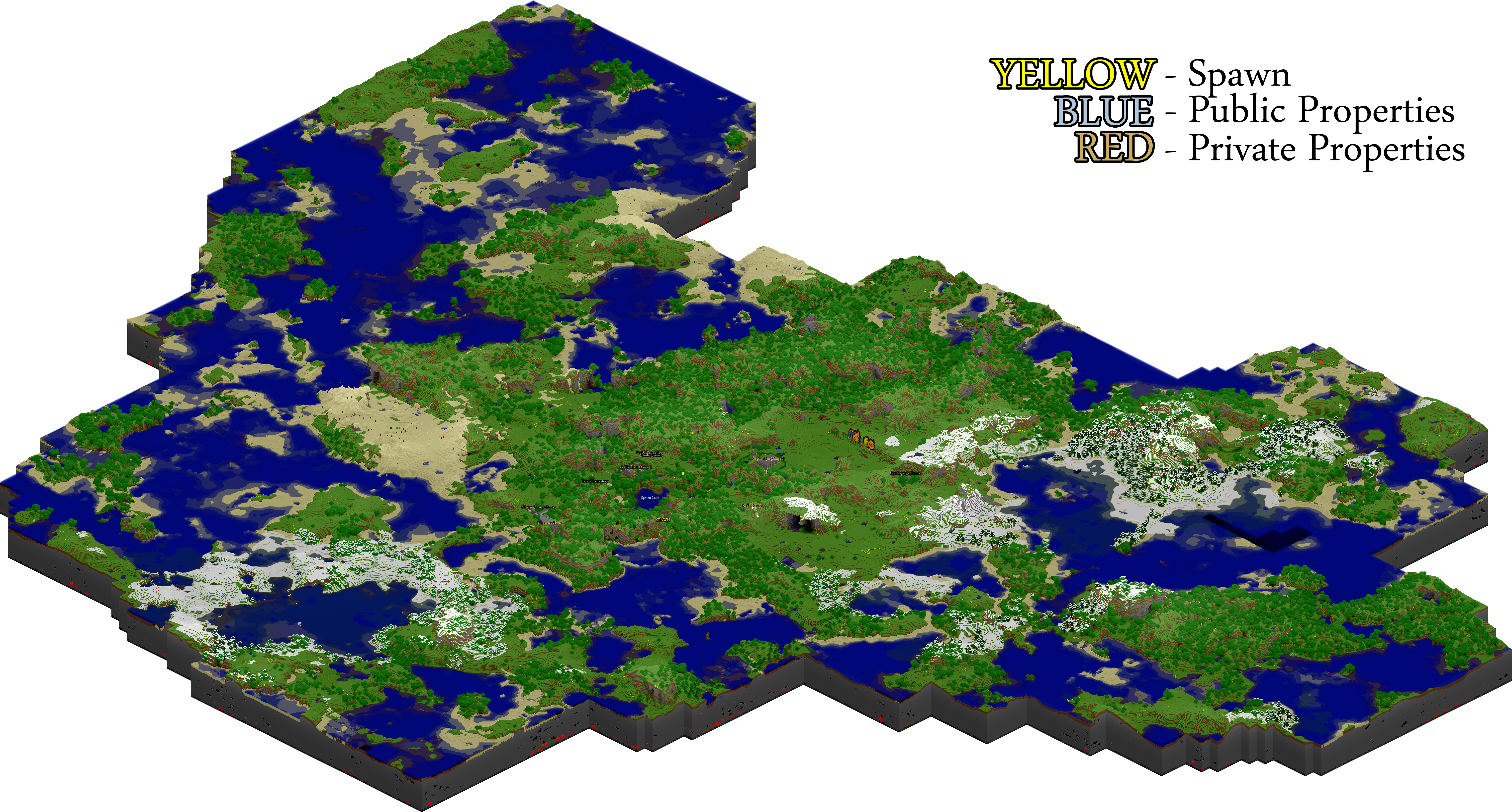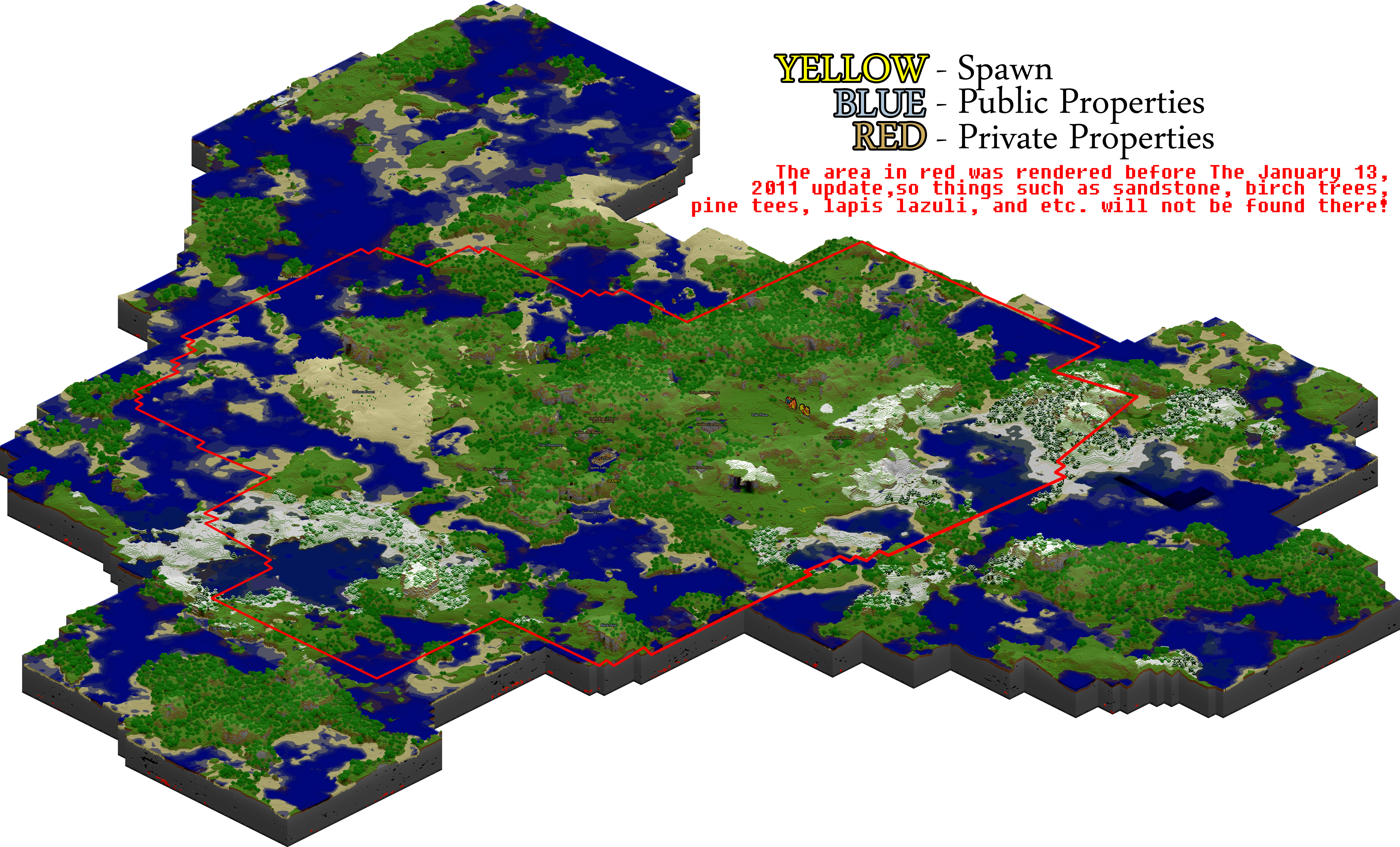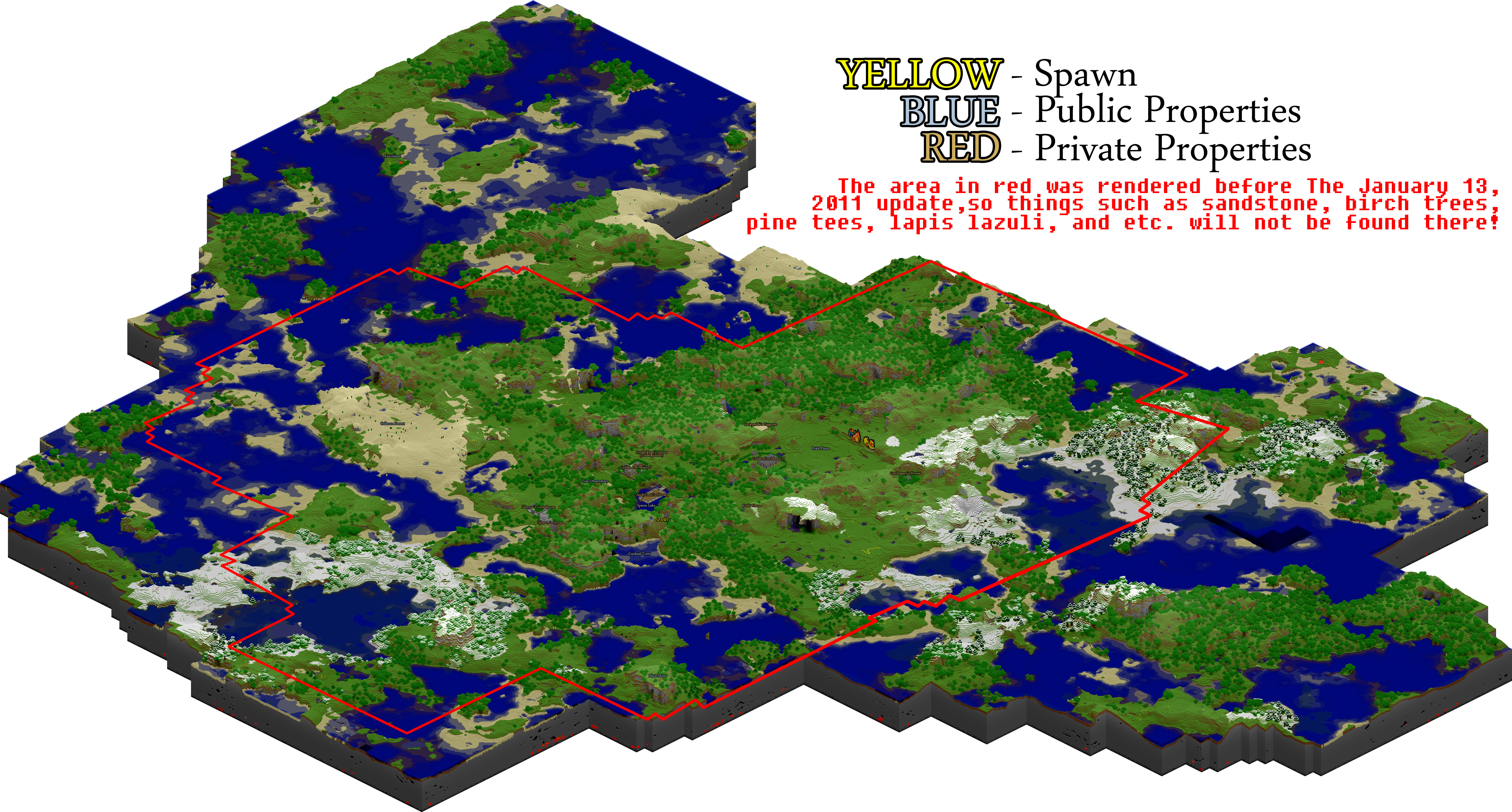 Labels are now officially present on the world map. If you have any properties that you would like to be labeled, you may send me a message about it. Names of public places that already exist cannot be changed unless you talk with me first! If you would like to name your property (EX: "Golden Fox Manor" instead of "Docithe and Feckyeslife's House") or change a property label in any way, you can send me a message regarding the change.