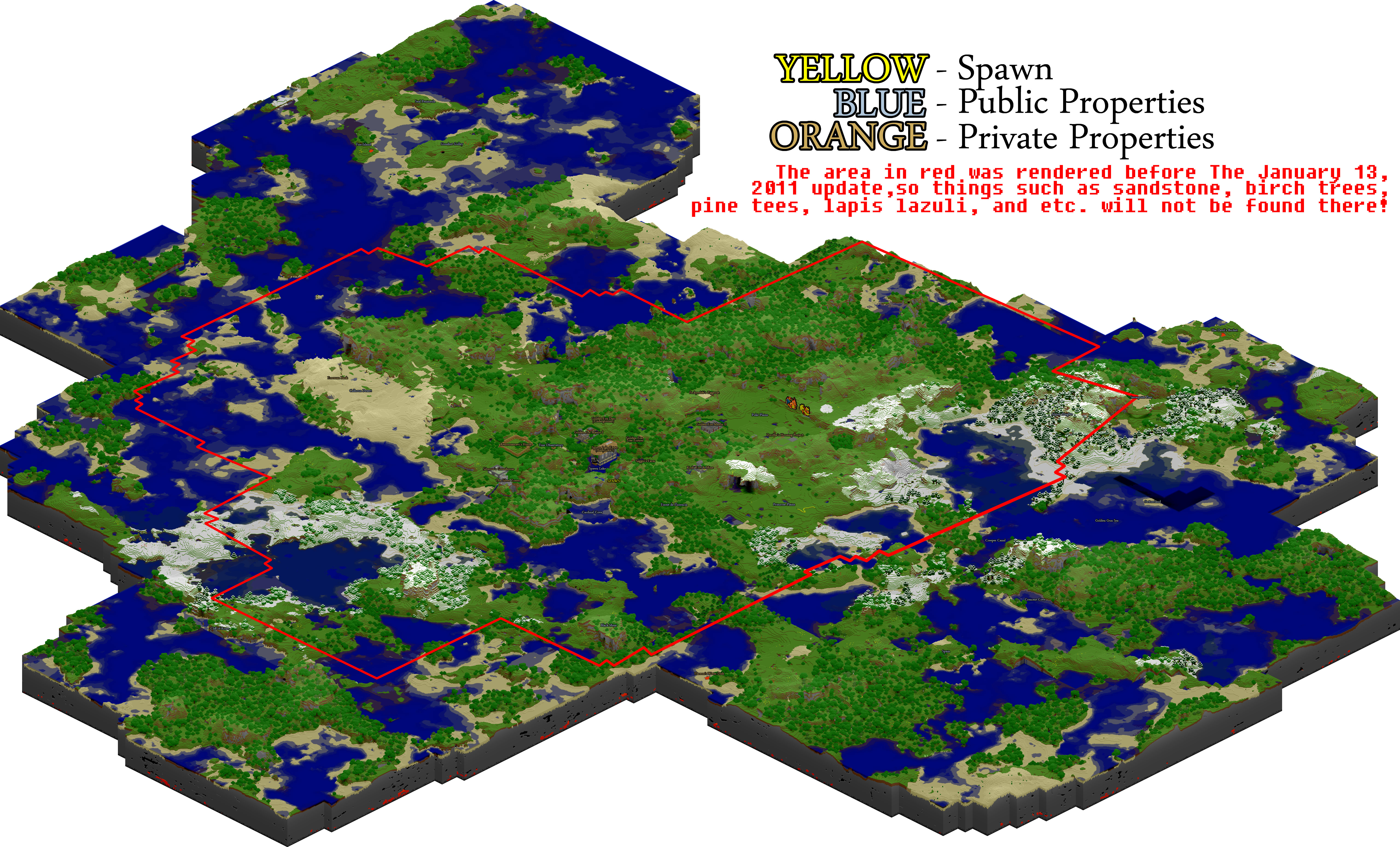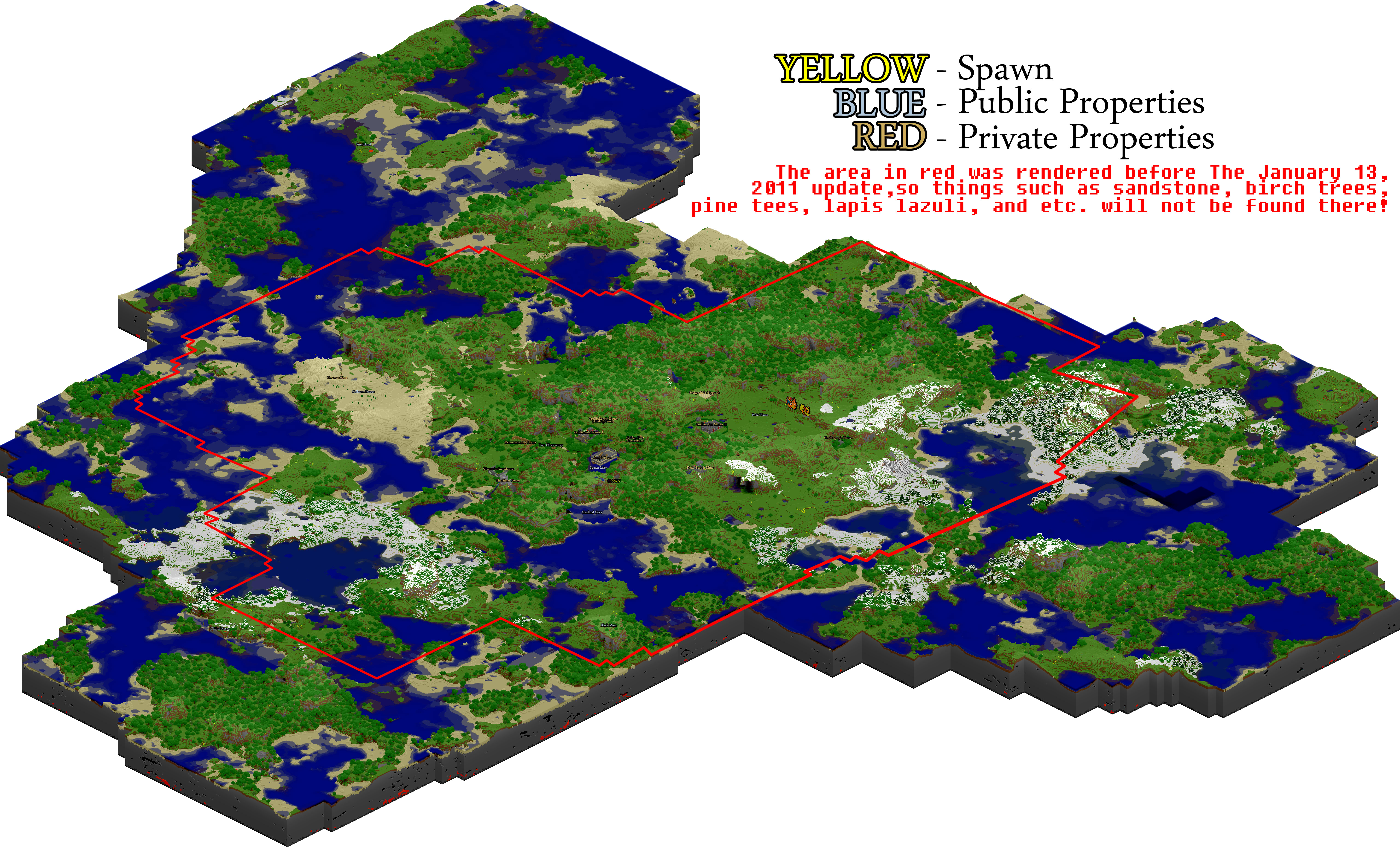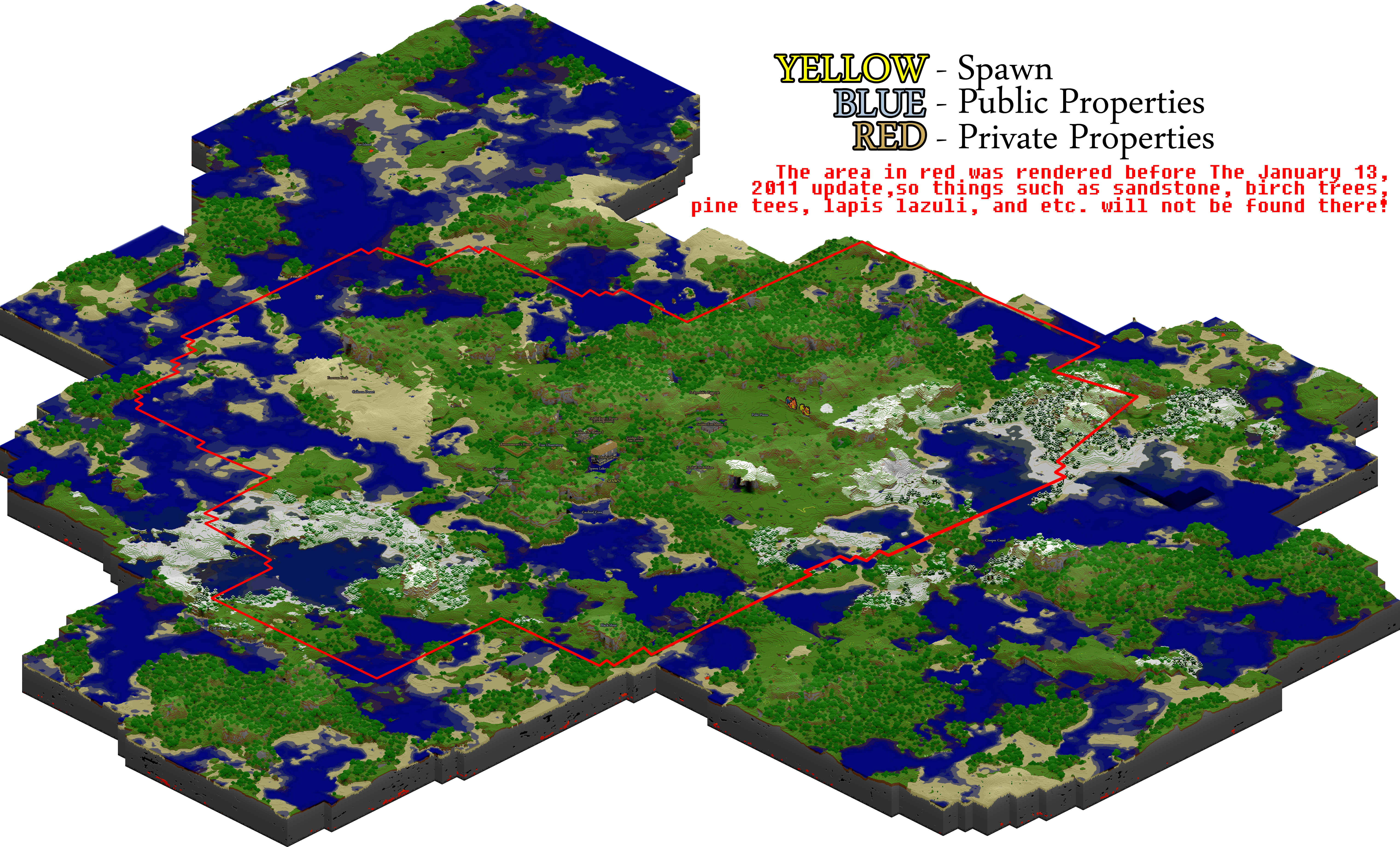Labels are now officially present on the world map. If you have any properties that you would like to be labeled, you may send me a message about it. Names of public places that already exist cannot be changed unless you talk with me first! If you would like to name your property (EX: "Golden Fox Manor" instead of "Docithe and Feckyeslife's House") or change a property label in any way, you can send me a message regarding the change.